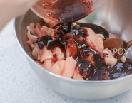 Na panvici rozpáľ olej a vlož doň marinované mäso. To opeč z každej strany. V extra nádobe zmiešaj spolu suroviny na omáčku a keď je mäsko dostatočne pripravené, zalej ho omáčkou a ešte povar, kým omáčka zhustne.