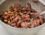 Všetky suroviny na marinádu zmiešaj a odlož nabok. Ak nemáš červené víno, daj biele, ale potom použi namiesto červeného biely vínny ocot do omáčky. Mäso pokrájaj na tenšie a kratšie rezance a spolu s arašidami primiešaj k marináde. Odlož na najmenej 30 minút do chladničky.