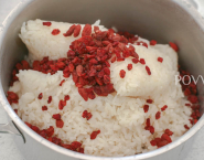 Medzitým daj uvariť ryžu v osolenej vode (alebo kuracej polievke, či vývare). Po jej uvarení ju sceď a podľa chuti do nej primiešaj sušené goji a dráč obyčajný. Drž v teple.