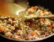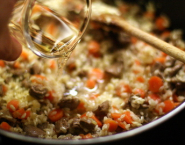 Pridáme obmytú ryžu, popražíme a podlejeme cherry. Mne tú dobrú cherry dala moja suseda Michelle. Ona vraj so žiadnym iným bielym vínom ani nevarí. Cherry je silnejšia a má aj hlbšiu chuť. Dobre premiešame a počkáme, až kým sa víno pomaly vstrebe do ryže.