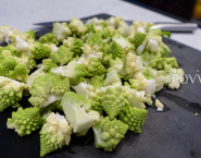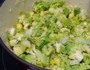 V hrnci rozpáľ olej a pór na ňom popraž do sklovita. Potom pridaj ružice Romanesca a kocky zemiakov, zalej všetko vodou, ochuť jemne soľou a nechaj uvariť až zelenina zmäkne.