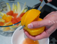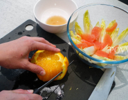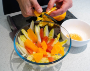 Grapefruit aj pomaranč umy, nakrájaj à la vif (na mesiačiky bez membrán) ale nad miskou, aby si zachytila vytekajúcu šťavu.