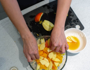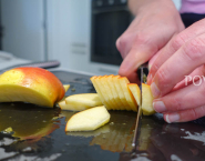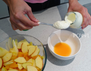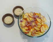 Jablko umy, prekroj napoly a odstráň jaderník. Potom ho nakrájaj na tenké plátky a tie okamžite namoč v zachytenej, citrusovej šťave, aby sa predišlo oxidácii jablka. Cibuľu očisť a nakrájaj na tenké polmesiačiky.