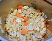 Šampiňóny očistíme a nakrájame na menšie plátky. Rovnko očistíme aj zeleninu a nakraájame ju na plátky, mrkvu na kolieska a jeden zemiak postrúhame do misky ako na placky.