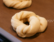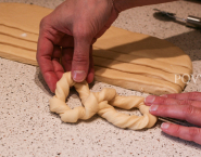 Cesto po prvom predkysnutí rozváľaj na pás dlhý 30 cm a hrubý 1 cm. Nakrájaj ho na 1 cm hrubé rezance a stáčaj oba konce v protismere, čím vytvoríš točenú šnúru. Tú prelož do osmičky a obe časti ešte raz cez seba a prelož koláč prelož na plech.