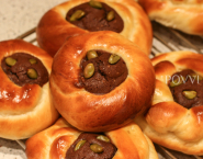 Koláče nechaj 60 minút podkysnúť. Potom ich potri rozšľahnutým vajcom a do ich stredu nastriekaj brownie plnku. Tú posyp kúskami opečených lieskových orieškov a koláče peč 10 minút pri teplote 220°C (teplovzdušné rúry -20°C) a počas pečenia ich podľa možnosti radšej stráž. Mne sa upiekli už za 8 minút.
