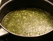 Pridaj najemno nasekané šťavelové listy a popraž spolu minútku. Zalej vínom a bujónom a nechaj zvariť na tretinu objemu.