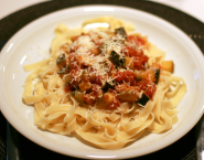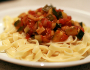 Tagliatelle uvar podľa návodu na obale. Rozpáľ olej v panvici opeč na ňom do sklovita šalotku a cesnak. Pridaj cuketu a za stáleho miešania popraž asi 3 minúty. Pridaj nakrájané paradajky a sušené paradajky. Nechaj cca 5 minút všetko jemne vrieť. Ochuť podrvenou kockou bujónu, soľou, korením, balzamikovým octom, lyžičkou cukru alebo medom a oreganom.