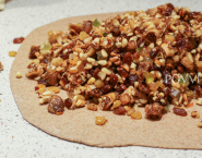 Zohrej 50 g medu s 50 ml bieleho vína. Zmesou prelej hrozienka s figami. Vlašské orechy, lieskovce, mandle a píniové oriešky nakrájaj nožom nahrubo. Sukade a kandizovanú pomarančovú kôru nakrájaj na malé kocky. Všetko vlož do misky, pridaj nastrúhanú kôru z polovice citróna a polovice pomaranča. Všetko spolu zmiešaj a nechaj cca.12 hodín odpočinúť.