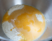 Do veľkej misy daj mlieko, roztopené maslo a 130 g tekvicového pyré. Pridaj aj vajce a dobre ho premiešaj s ostatnými surovinami. Teraz do misy pridaj cukor, soľ a sušené droždie a dobre premiešaj. POZOR! Teplota zmesi by nemala byť vyššia ako 40°C, inak sa kvasinky udusia a nebudú kvasiť.
