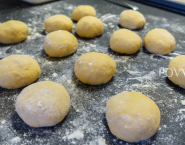 Po vykysnutí ho premies 2-3 minútky na pomúčenej doske, abybolo vláčne. Potom z neho nakrájaj 14-15 rovnakých kúskov. Ja ich vážim na 50 g. Z kúskov vytvaruj okrúhle žemličky, ale ešte ich na plech neukladaj. Plech vylož papierom, alebo fóliou na pečenie.
