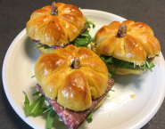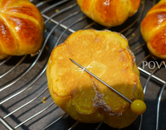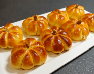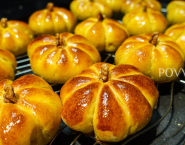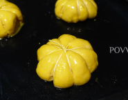 Žemličky pred pečením potri zmesou vajíčka a 1 PL vody. Tým pri pečení získajú nádherne lesklú a zlatú farbu. Potom použi špičku tyčinky alebo niečo podobné, aby si spravila malý otvor v strede cesta. To je miesto, kde budeš dávať stopku tekvice (polovicu orieška).