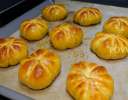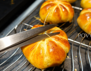 Žemličky poukladaj na plech na pečenie vo vzdialenosti 3 – 4 cm od seba. Pomúč si ruky a buchtičky jemne stlač. Nožnice namoč do oleja a potom cesto zo 6 strán nastrihni ako lupene kvietkov. Nezabudni nožnice pravidelne ponárať do oleja.