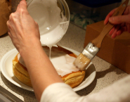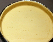 Zo zvyškov cesta nakrájaj dlhé prúžky široké 1 cm a hrubé 2 mm. Frangipane tortu oblož po obvode prúžkami, nechaj 20 minúť postáť a peč v rúre vyhriatej na 180°C (teplovzdušné rúry -20°C) do chrumkava.