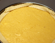 Pripravené cesto uprav do vymastenej formy na pečenie (alebo do formičiek na minitorty). Dno cesta popichaj vidličkou a potri marhuľovým lekvárom. Naň navrstvi plnku.