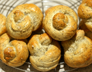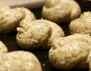 Povykysnutí cesto premies a vykroj z neho 12 rovnakých kúskov. Každý z nich vyváľaj do šúľka, z ktorého vytvoríš uzlík. Uzlíky ulož na vymastený, alebo papierom na pečenie vyložený plech a nechaj ešte 20 minút podkysnúť. Medzitým predhrej rúru na 200°C (teplovzdušné rúry -20°C). Každý uzlík potri pred pečením bielkom a hrubozrnou soľou, prípadne ešte makom. Peč ich cca 15 minút a po upečení nechaj ochladnúť na mriežke.