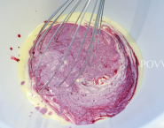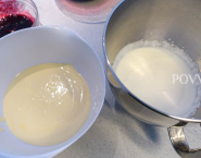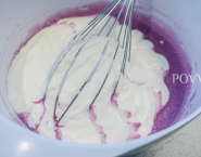 Keď je krém hotový, primiešaj k nemu čučoriedkové couli s primiešanou želatínou a dôkladne premiešaj. Nakoniec vyšľahaj do polotuha aj šľahačku a primiešaj ju k žĺtkovému krému.