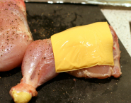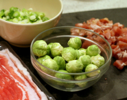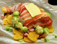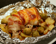 Alobal vymasť olivovým olejom. Zemiaky očisti, nakrájaj na plátky a vlož do misy. Polej ich jemne olejom, posyp soľou a korením a premiešaj. Navrstvi ich na vymastený alobal, posyp nakrájanou cibuľkou a kúskami slaninky a na vrch ulož kuracie stehno preložené plátkom čedaru a zabalené do slaniny. Nakoniec pridaj zopár kúskov ružičkového kelu a na vrch polož malý plátok masla. všetko zabaľ dôkladne do alobalu a peč pri teplote 200°C asi 1 hodinu.