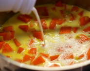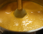 Pureer de gare pompoen met de geraspte gember, de crème fraîche en een groot deel van de melk met de keukenrobot. Voeg melk toe totdat de soep de gewenste dikte krijgt. Serveer de soep goed warm.