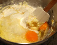 Meng zachte boter tot schuimig. Voeg amandelbroyage, citroenzest, eieren en bloem toe en meng alles tot zacht beslag. Als je een frangipane-mix gebruikt, voeg dan geen bloem meer.