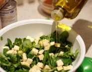 Was en droog intussen de veldsla. Mocht je nog een sjalot over hebben snij het fijn en meng met de kaas en de noten door de salade. Maak de salade aan met olijfolie en zout en peper.