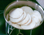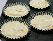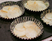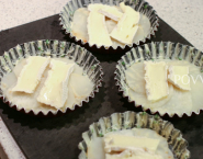 Snij de knolselder in plakken van 2 mm dikte en stans er cirkels uit. De diameter van de knolseldercirkels moet de helft van de diameter van de ovenschaaltjes zijn. Blancheer de knolselder één minuut in gezouten, kokend water. Spoel onmiddellijk af in ijskoud water en dep droog. Schik de schijfjes knolselder trapsgewijs in de vormpjes. Leg erbovenop een stukje kaas.
