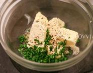Meng de boter met de bieslook, geperste knoflook, peper, zout en een beetje citroenschil. Verdeel de boter over 4 individuele ovenschaaltjes.