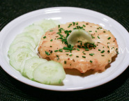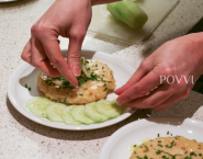 Neem de schaaltjes uit de oven. Draai om en neem de vorm eraf. Werk af met ringen komkommer.