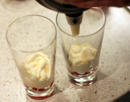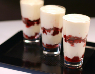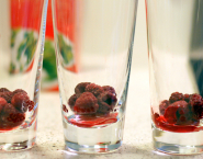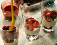 Doop een biscuit in de frambozen coulis en leg ze in de glas. Leg op de biscuit een laag frambozen en dan verdeel de room gelijkmatig over. Leg er vervolgens weer een laag in frambozen coulis gedrenkte biscuits op en daarna nog een laag frambozen en een laag slagroom.