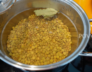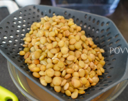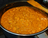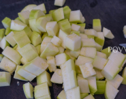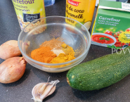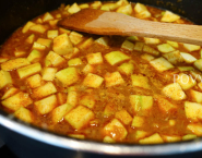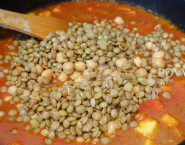 Voeg de courgettes toe en kook nog 2 minuten. Als de kruiden beginnen te houden aan de bodem van de pot, voeg dan een klein stukje water uit gekookte linzen.