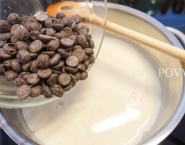 Verwijder het vanillestokje en voeg de kleine stukjes chocolade toe. Meng tot de chocolade volledig gesmolten is.