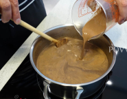 Voeg al roerend het mengsel van cacaopoeder en maizena bij de hete melk. Laat nog even opkoken tot de melk bindt.