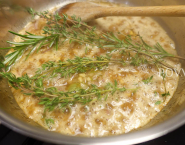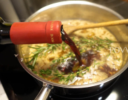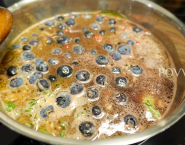 Doe de wijn, fond, de kruiden en blauwe bessen samen in de kookpan en kook ongeveer 15 minuten.