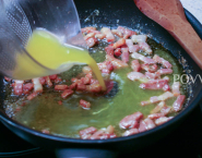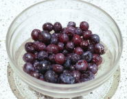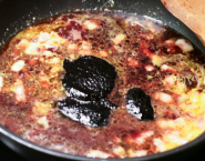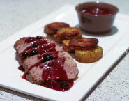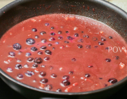 Smelt in andere pan de rest van de boter en bak de spekjes in ca.3 minuten. Voeg de sinaasappelsap, wijn, mosterd, bubble confituur, de bosbessen en de slagroom bij. Roer alles door elkaar en laat zachtjes 10 minuten koken. Roer de saus af en toe.