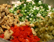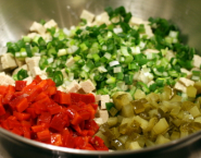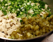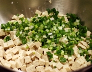 Snij de tofukaas in kleine blokjes van zo’n halve centimeter en doe ze in een grote kom. Snij de pijpajuin, de komkommer en de champignons fijn en voeg ze bij de tofu. Als je de sla voor het diner maakt dan kan je de champignons eventueel weglaten. Zo is het s’avonds voor iedereen lichter te verteren.