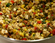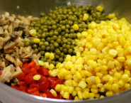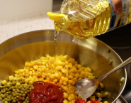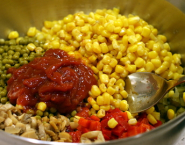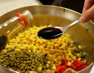 Voeg dan de gesteriliseerde erwten en de maïs toe (voor mijn zoon voeg ik zeker genoeg maïs toe omdat ze voor jongeren extra voedzaam en gezond is). Snij de gesteriliseerde paprika ook in blokjes gelijk tofu. Daarna voeg je de sojasaus, de ketchup en de olie erbij en meng je alles goed door elkaar. Breng dan de sla op smaak met peper en, indien nodig, een beetje zout en zet de sla voor minstens één uurtje in de koelkast.