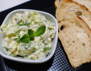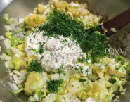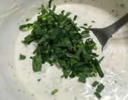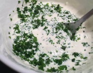 Doe in een tweede kom de zure room, geperste knoflook, geraspte citroenschil, gehakte kruiden. Meng alles samen en breng op smaak met peper en zout.
