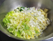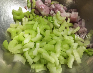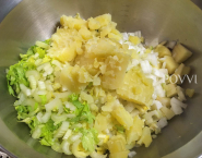 Kook de aardappels, laat afkoelen. Schil ze vervolgens en snijd ze in kleinere blokjes in een kom. Reinig de selderij en venkel en snijd ze in kleinere plakjes en voeg ze toe aan de aardappelen. Snijd de sjalotten en pijpuien fijn en voeg toe aan de andere ingrediënten. Voeg ten slotte de plakjes appel toe.