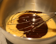 Smelt de chocolade en de boter voor het cakebeslag in de magnetron of bain-marie. Klop de dooiers los, doe ze met de vanille bij de gesmolten chocolade en klop alles goed door elkaar.