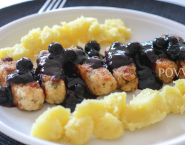 Serveer de vingers met aardappelen op verwarmde boorden en giet over met bosbessensaus.