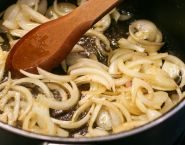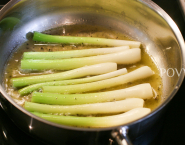 Was de uitjes en snijd ze in stukjes van ca. 7 cm. Stoof de uitjes op een matig vuur gaar in een beetje boter, water, peper en zout.