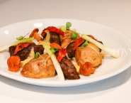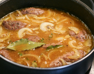 Giet het vet uit de pan, smelt de overblijvende boter in dezelfde pan en stoof de ui. Voeg de overige ingrediënten toe en roer goed om. Doe de saus samen met de varkenswangen en kook ca.1 uur tot de wangen klaar zijn.