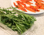 Schik de varkenswangetjes op een warm bord, samen met de lente-uitjes, en dooierzwam. Werk verder af met de rucola, tomaatjes, basilicum cress en de bearnaise saus.