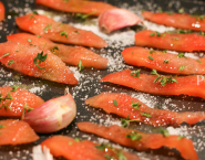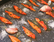 Snij ontvelde tomaten in twee en haal de kern en de pitjes eruit. Leg ze op een bakplaat met bakpapier. Strooi tijm, flink wat suiker, olijfolie en peper en zout over de tomaten. Duw met de platte kant van een mes op een bol look en leg de teentjes bij op de bakplaat.