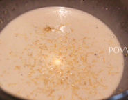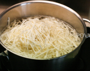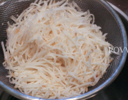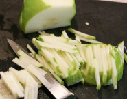 Breng in een pan 1 liter water met 1 eetlepel citroensap aan de kook. Leg de knolselderijreepjes 1 minuut in het kokende water en laat ze daarna in een vergiet goed uitlekken.
