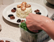 Verdeel de sla over een schaal. Schep de knolseldersalade in het midden en leg de plakjes kipfilet erop. Garneer de salade met druiven en walnoten.