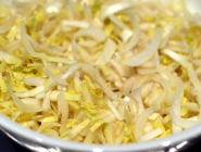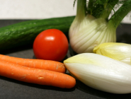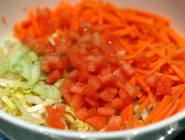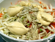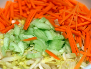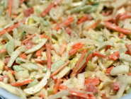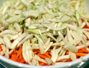 Snijd witloof fijn. Snijd de venkel en wortel in lucifers. Komkommer in de helft snijden, ontpitten en ook in lucifers snijden. Meng alle ingrediënten zachtjes onder elkaar.