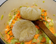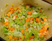 Bak de prei in de olie tot glazig. Voeg de wortelstukjes en selder en bak even samen. Als laatste voeg ook de blokjes aardappel en giet af met visfumet.