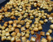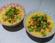 Serveer met croutons en werk af met gehakte selderblaadjes.