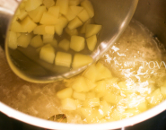Kook de aardappelen in licht gezouten water samen met een paar korrels van komijn gaar. Voeg de gare aardappelen samen met water, waarin ze gekookt zijn bij de gare zuurkool.